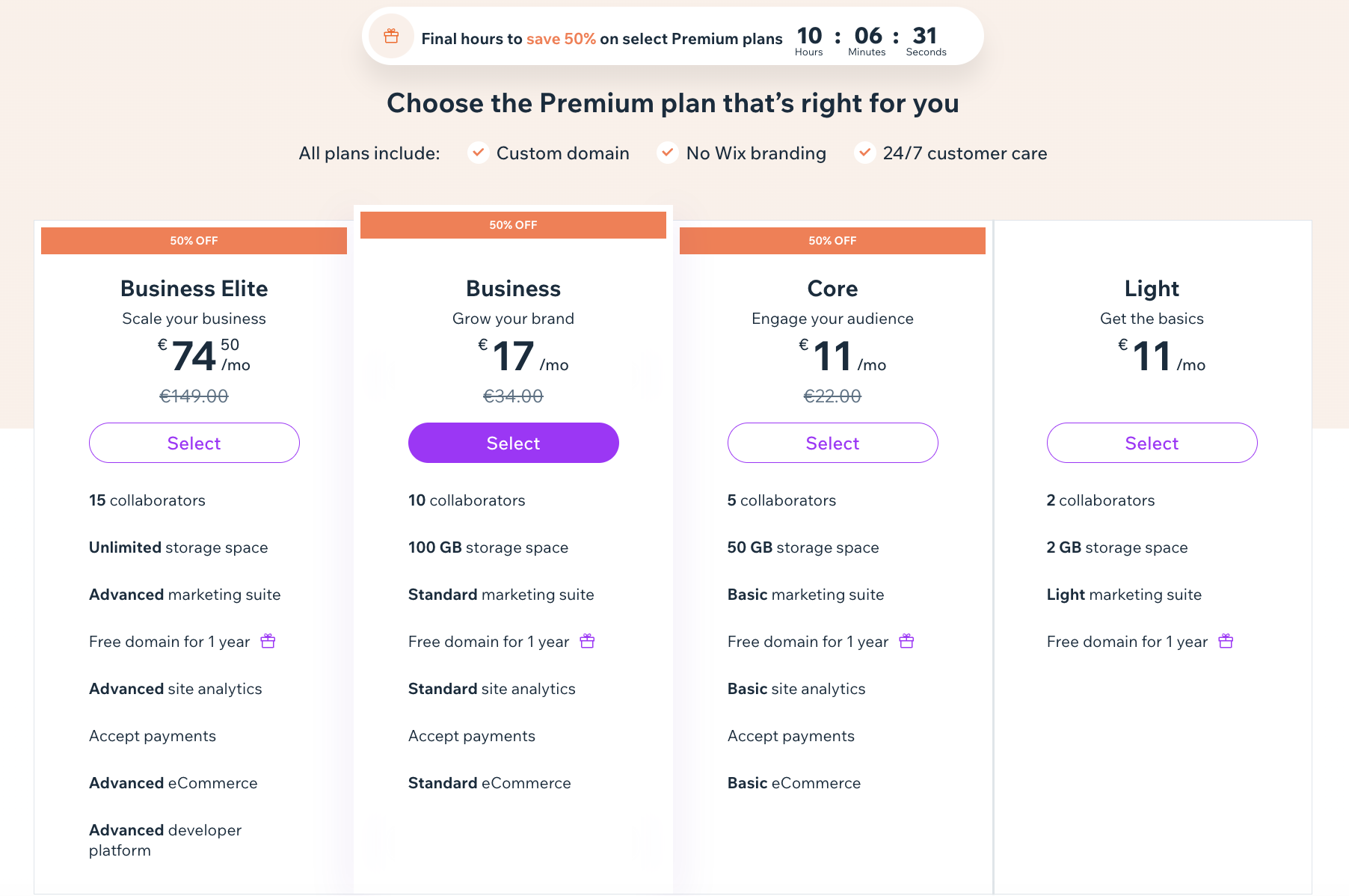 Note: Wix also offers a free plan, but this is quite limited. Here, we’re comparing the price of their cheapest plan (“Light” or “Core”) with that of Bluehost’s most affordable plan.