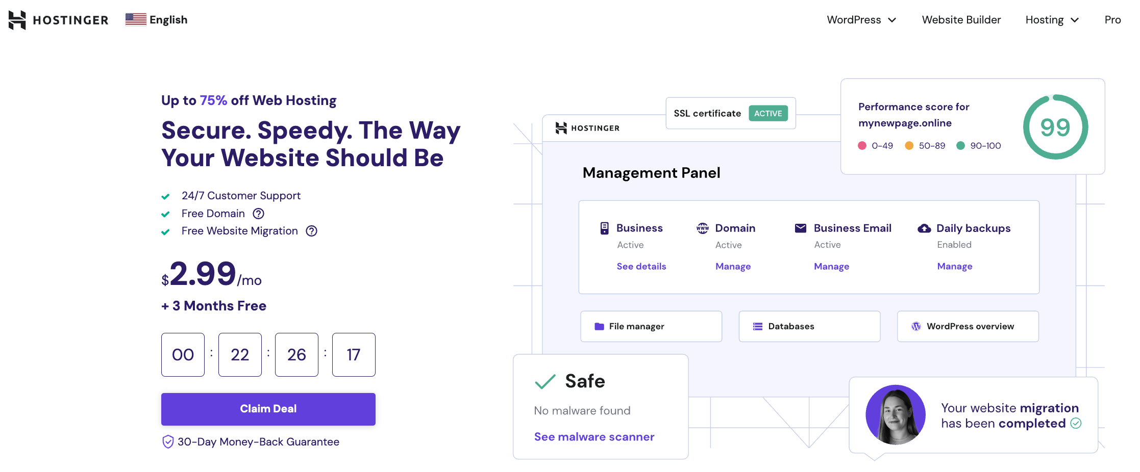If you’re looking for a solid hosting plan that’ll cost you very little and still give you (almost) everything you need to build an online presence, then Hostinger’s $2.99/mo plan is it. Not only do you get tons of useful features and a user-friendly hosting company, but when you outgrow their starter plan, upgrading to the next tier is still affordable at $3.99/mo.