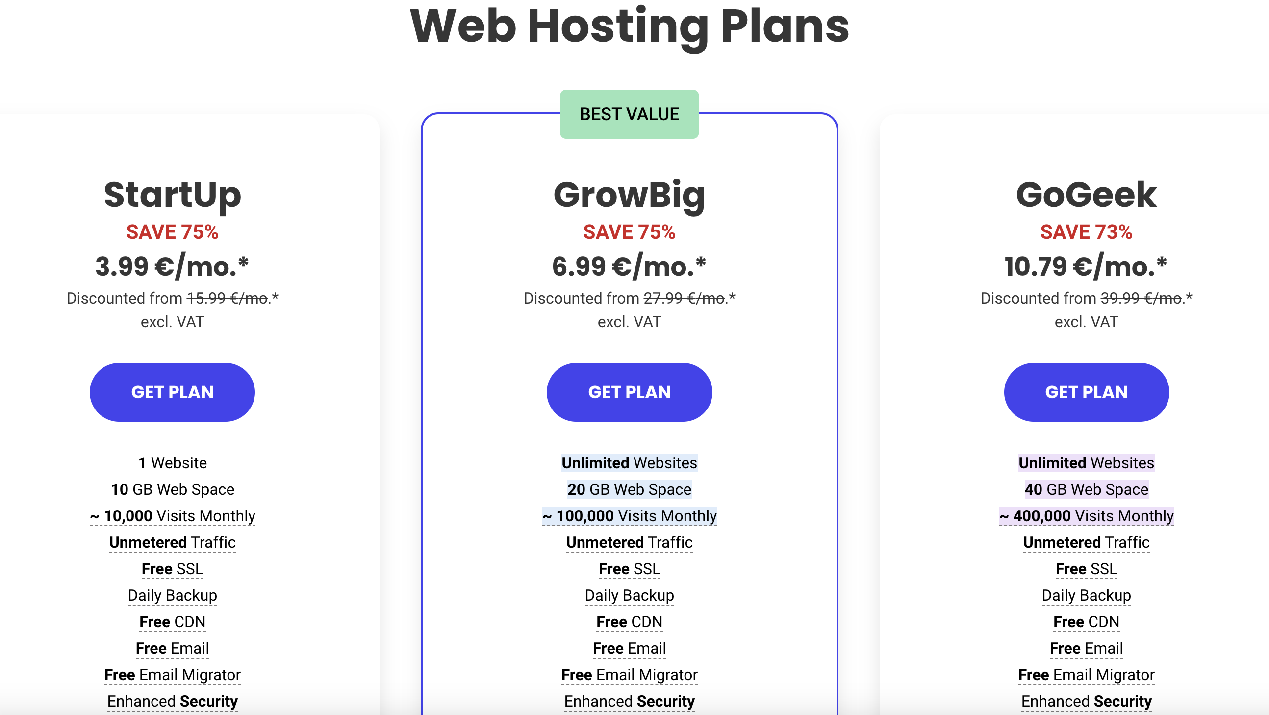 If you don’t already have a SiteGround account, head over to the SiteGround website. First, you need to choose a plan — just click the “Get Plan” button for whichever one you want.
