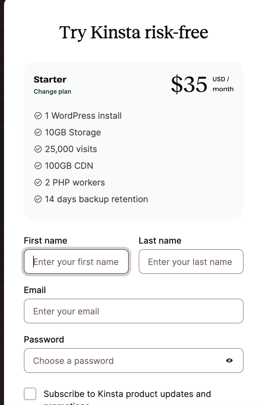 Here’s what comes with Kinsta’s monthly billed web hosting plan (the Starter Plan @ $35.00/mo):