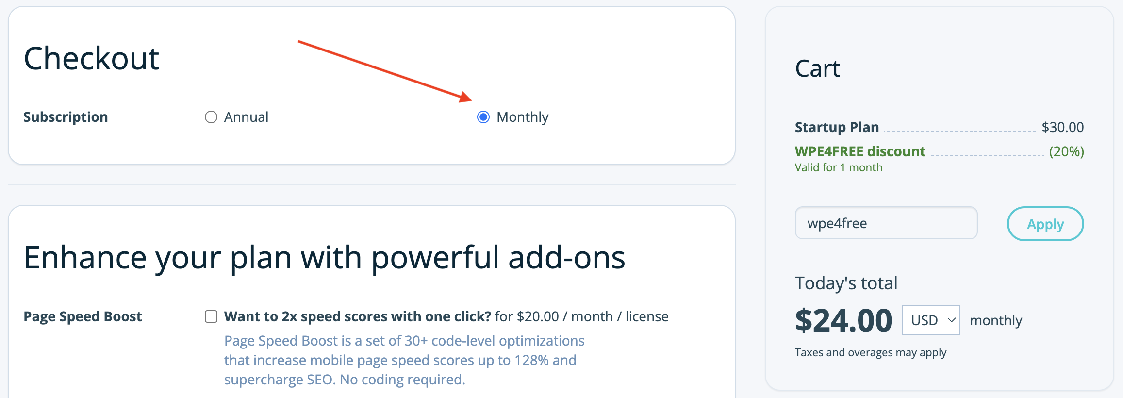Before starting the checkout process on this page, just be sure to toggle the slider at the top over to the “Monthly Hosting Plans” option and you’ll see the prices update accordingly.