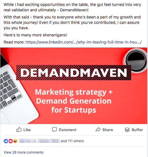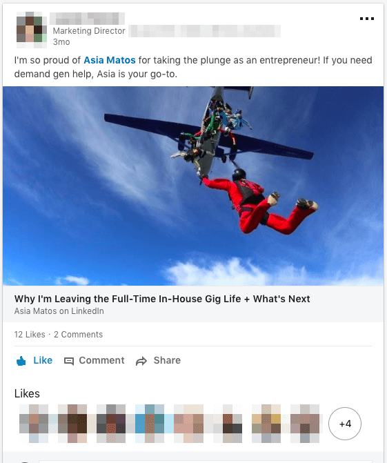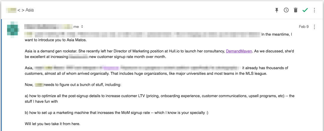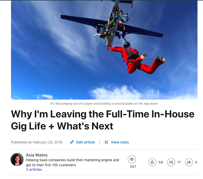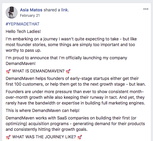 Asia Matos of Demand Maven quit her day job completely cold turkey earlier this year (without any clients, major deals in the works or a huge savings account to pad herself for months without an income). Since then, she’s been building a solid freelance business for herself, where she partners with early-stage SaaS companies to help build their marketing engines and get them to their first 100 customers.