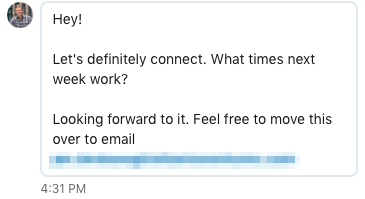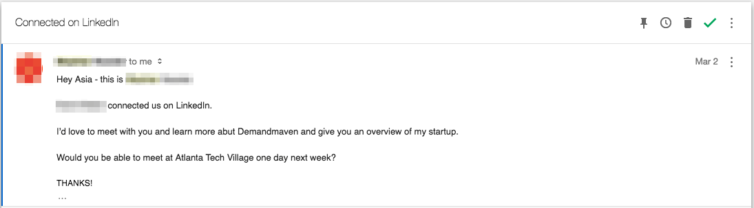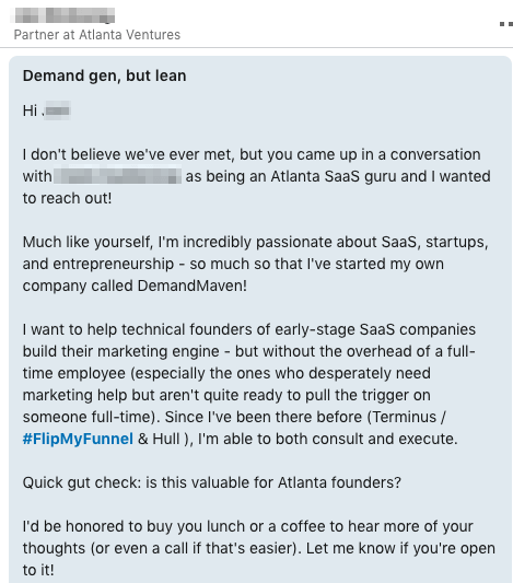 I sent a cold LinkedIn message to one of the partners from Atlanta Ventures (they run a kickass community over at Atlanta Tech Village), and warmed it up as much as possible with some common history: