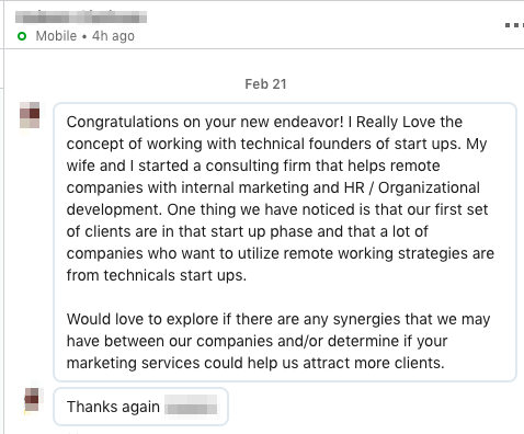 - Reach out to exact people who were my target market – in this case, technical founders of startups or consulting firms