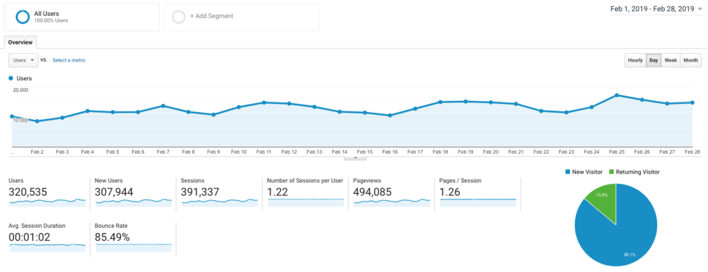 I was up in Sessions from January by just under 6%. On top of the sessions increase, I moved up to 494,085 pageviews.