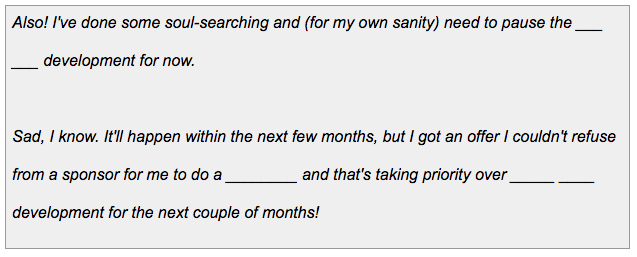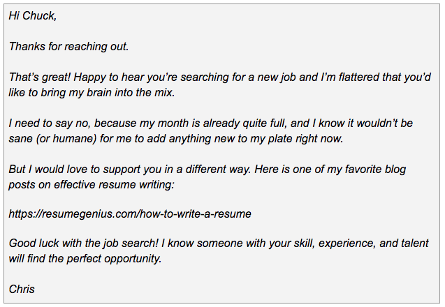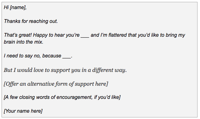 Here’s an example of a great “no” email I received recently. In fact, I like it so much that I thought I would turn it into a template for myself as well:
