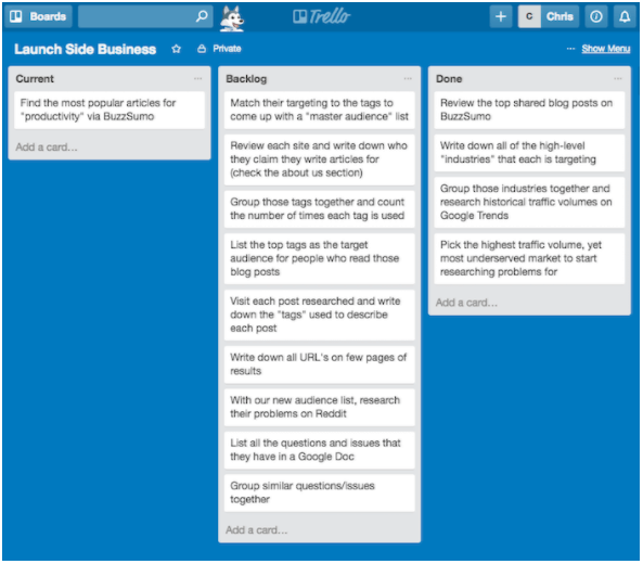 I’ve set up a Trello board called “Launch Side Business.” That’s my one goal that will have the biggest impact on my life.
