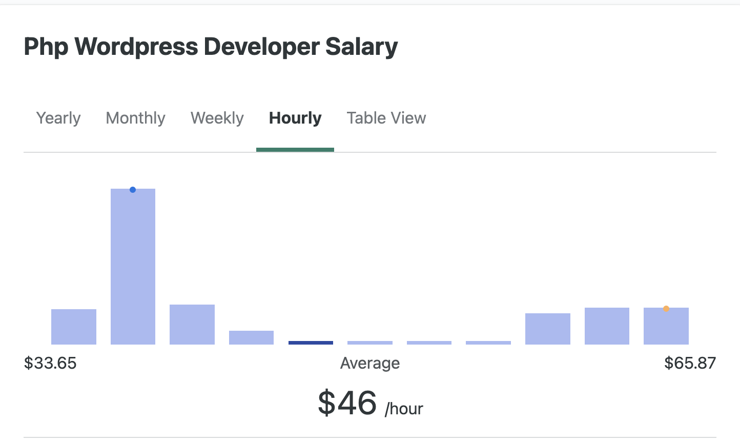 According to ZipRecruiter, hourly WordPress developer job rates range from $33.65/hr to $65/hr+ and are, of course, dependent on several factors, with experience naturally being one of the most significant.