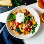 When the tomatoes and corn are almost done, crisp up the cauliflower gnocchi. Heat up the remaining oil over medium high heat. Add the cauliflower gnocchi, frozen from the bag, and fry until golden brown and crispy, flipping once, about 2-3 minutes per side. Season with salt and pepper.