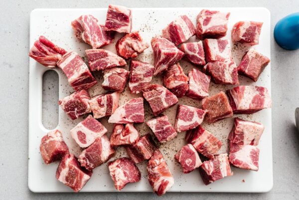 Cover the bottom of your instant pot with high heat oil (about 2tbsp) and preheat on saute high. Cube the pork and season with salt and pepper, keeping an eye on the instant pot to make sure it’s not smoking.